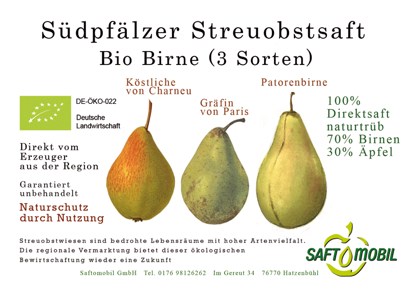 Bio Birnenssaft3 Sorten: Köstliche von CharneuxGräfin von ParisPastorenbirne0,97 L Flasche