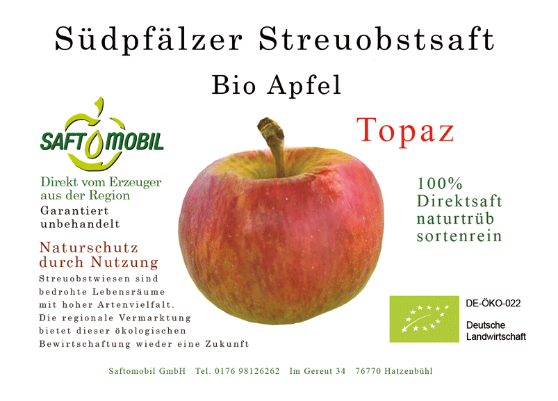 Bio ApfelsaftTopaz sortenreinaus regionalem Bio Obstanbau 1L Flasche 5L Box |